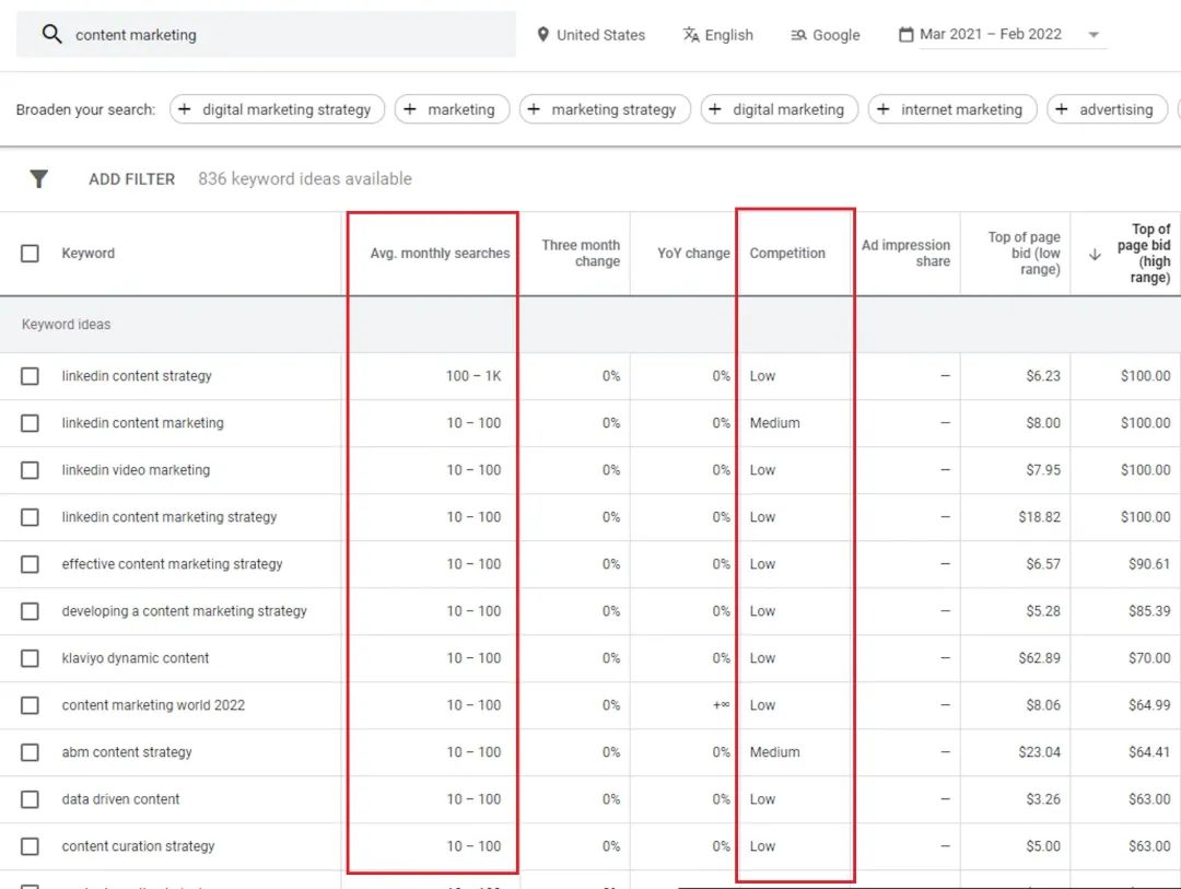 随后,点击“获取结果”,你将看到每个关键字的“平均每月搜索量”,这可以帮助你了解它们的搜索频率。同时,关注竞争程度,它会显示为“低”、“中”或“高”。